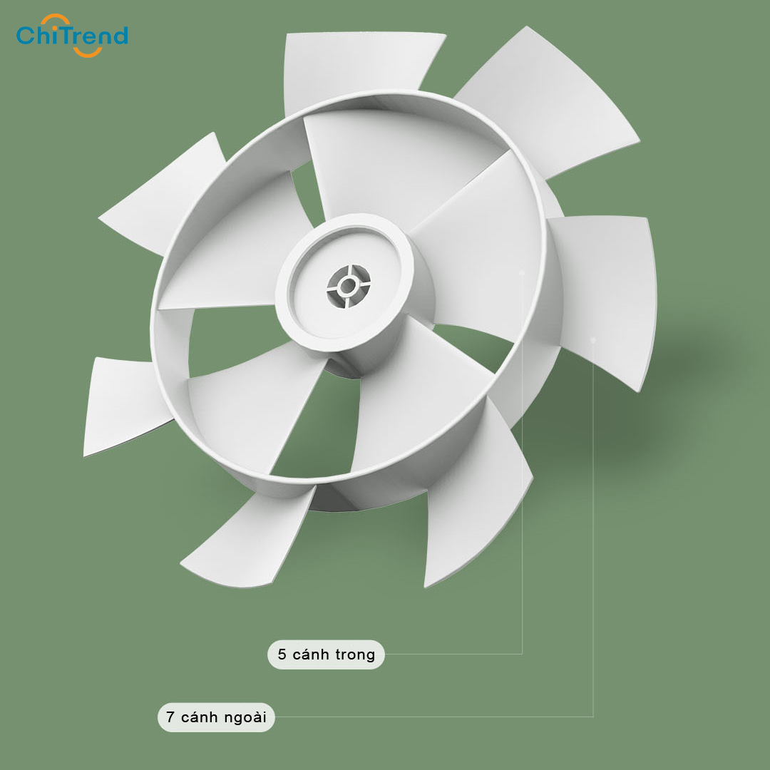 – 5 cánh quạt bên trong: Các cánh quạt nhỏ hơn ở lớp bên trong được thiết kế để tạo ra luồng gió nhẹ nhàng, êm ái, mô phỏng cảm giác gió tự nhiên.